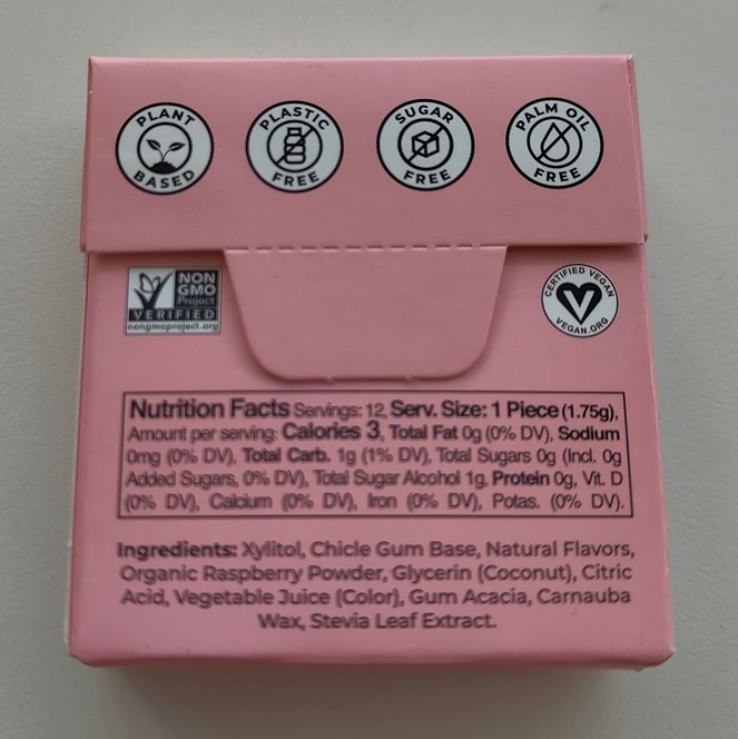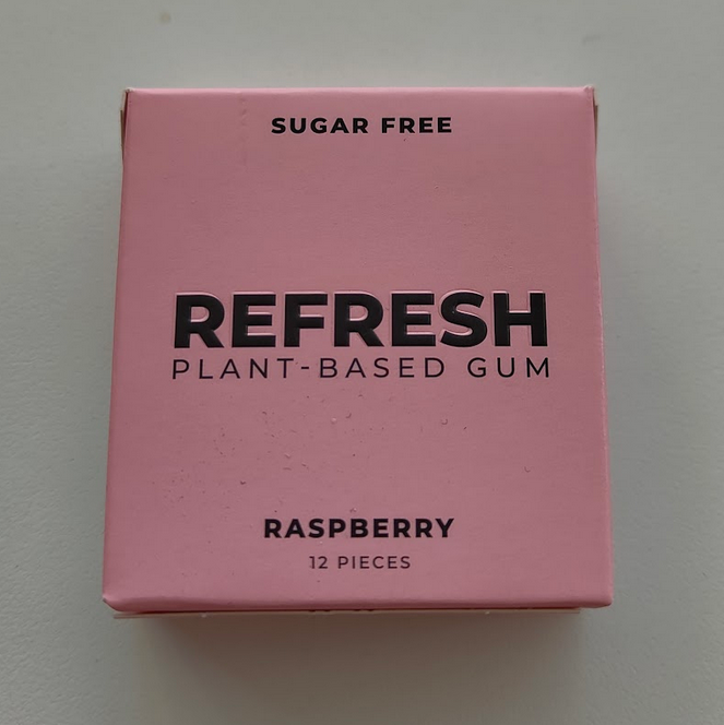 The gum pieces are a little smaller but still substantial, with a good mouthfeel. After chewing and “breaking in” the gum, it becomes noticeably firmer and a little stickier than your typical convenience-store Trident or Orbit. However, unlike its non-plant-based counterparts, Refresh gum maintains the same texture and does not lose any pliability or softness, even after hours of chewing. The flavor itself is not as strong but lasts much longer. I can still taste a pleasant raspberry note after more than two hours of chewing. There is no mint or cooling sensation at all. When I first started chewing, it had a uniquely slightly salty tinge to it. Underneath the raspberry flaor, there is a unique woody flavor to it as well. |